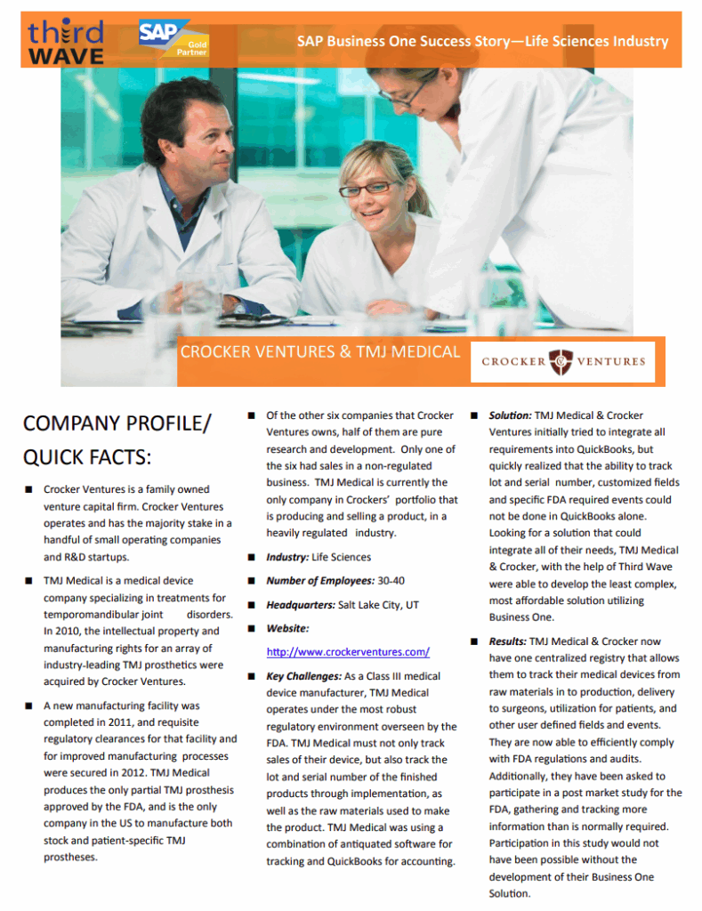 Crocker Ventures acquired TMJ Medical, a Class III medical device manufacturer. Overseen by the FDA, TMJ Medical must track sales of their devices, lot and serial number of the finished products, and the raw materials used to makethe products.